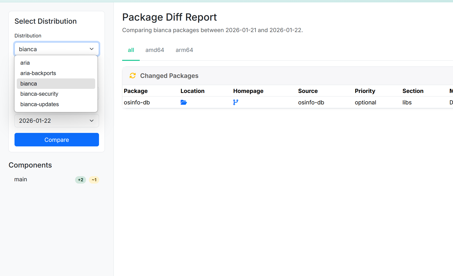 The eLxr Mirror Tracker now tracks package changes for both aria and bianca distributions, providing comprehensive visibility into added, removed, and updated packages on a date basis. Installation testing verifies package integrity and compatibility.